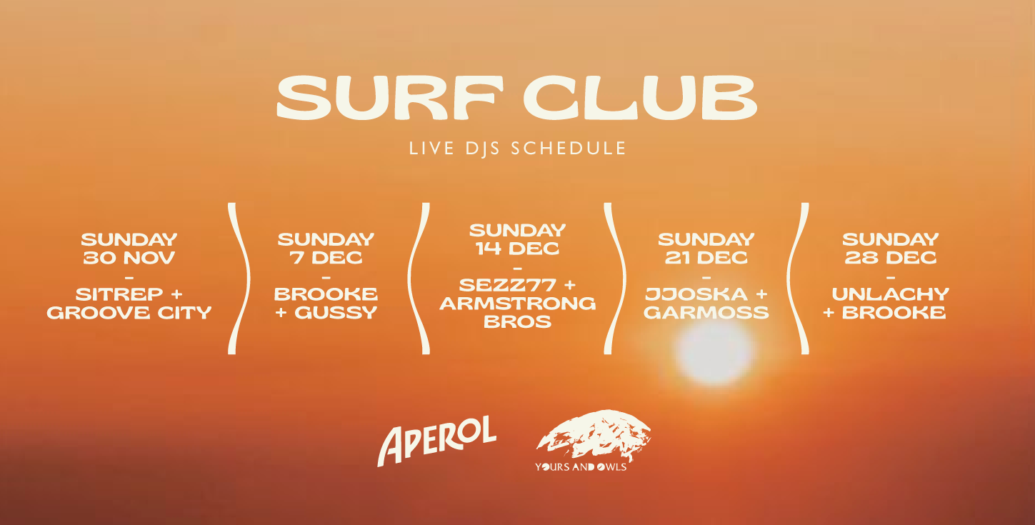 Surf Club Sundays kicks off Sunday 30th at The Boathouse North Wollongong. Expect weekly Yours & Owls artists, a few moves on the terrace, and $18 Spritz or 2-for-$30 Aperol Spritz all afternoon.